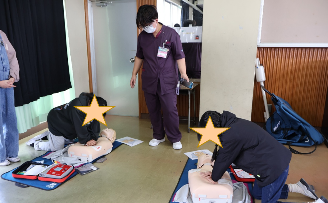 看護師の仕事について講義を行い、そのあと技術体験をしてもらいました。